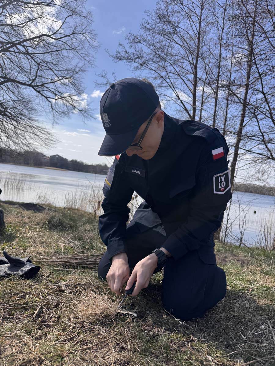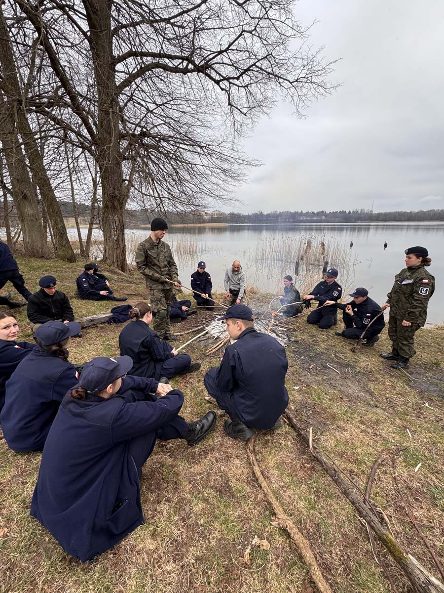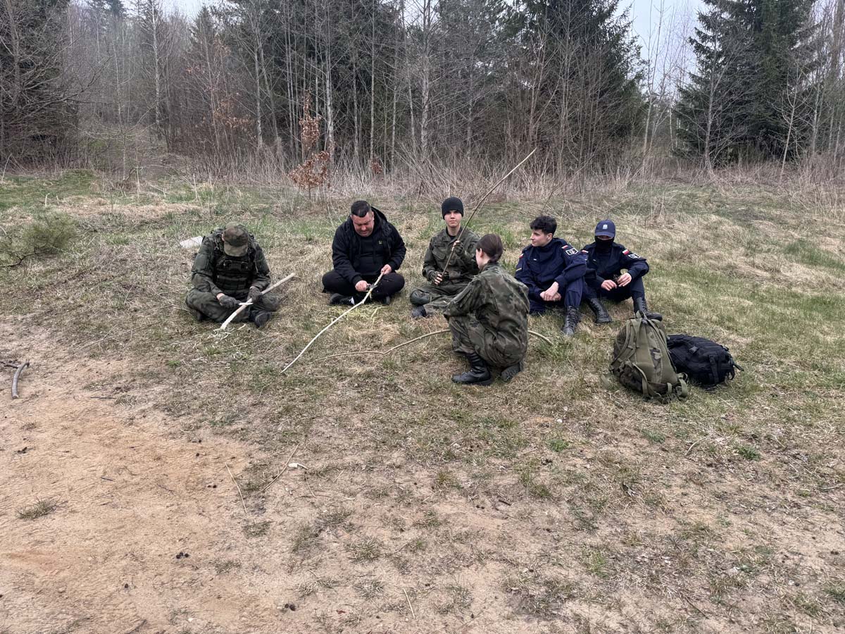 Uczestnicy rozpoczęli od zajęć survivalowych – była teoria, ale przede wszystkim praktyka. Poznali podstawowe zasady przetrwania, uczyli się rozpalania ognia przy użyciu krzesiwa, a następnie przeszli do budowy schronień. Powstały szałasy, które mają jedno zadanie – dać ciepło, bezpieczeństwo i realną szansę przetrwania w terenie.